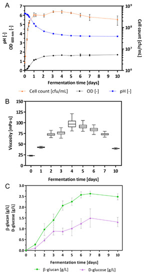 Growth characteristics of the fermentation broth: (A) cell count in cfu/mL, OD, and pH, (B) changes in the viscosity, and (C) β-glucan and D-glucose concentration in culture supernatants. Values are mean values of four-fold biological replicates including standard deviations.