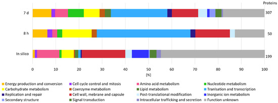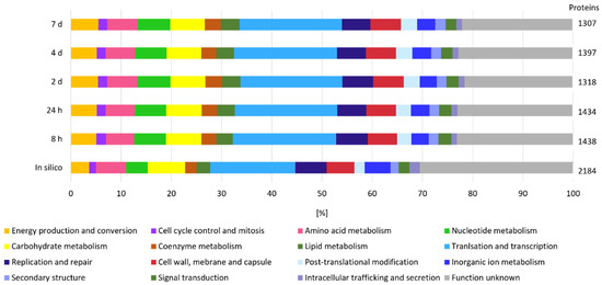 The proteome analyzed in silico counted 2184 annotated proteins, which were used for COG and functional characterization (Figure 5). COG prediction of the in silico proteome showed a pattern similar to that of the expressed proteins at the five time points. A total of 30% of the expressed proteins could not be categorized (unknown function). Between the five time points (8 h, 24 h, 2 days, 3 days, and 7 days), no significant difference was observed according to the distribution of the groups. The COG analyses of the expressed proteins accounted for translation and transcription ~20% each: ~7% were related to carbohydrate metabolism and approximately 5% were clustered for energy production and conversion. Proteins of the last two groups are considered to be related to polysaccharide formation and degradation, among others.