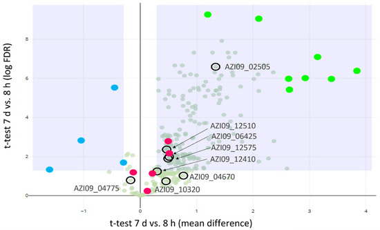 The secretion of four proteins were higher after 8 h compared to 7 days. Those four proteins were annotated as phosphoketolase (AZI09_09710), NlpC P60 family (AZI09_02850 and AZI09_01220), and LSU ribosomal protein L3p (L3e) (AZI09_03445) (Figure 3, blue dots). After 7 days, the number of secreted proteins increased significantly, including the ABC transporters (AZI09_01955 and AZI09_00135), ribosomal proteins (AZI09_03485 and AZI09_05315), and uncharacterized proteins (AZI09_10715 and AZI09_11665) (Figure 3, green dots).