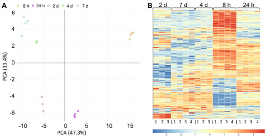 To examine how protein expression changes during fermentation, we measured the proteome of L. brevis TMW 1.2112 at five time points during fermentation, in the exponential (8 h), stationary (24 h to 4 d), and early death phases (7 d). L. brevis TMW 1.2112 genome contains 2537 predicted protein coding genes, and 1641 proteins were identified by proteomic analysis. This corresponds to a proteome coverage of approximately 65%, which is in the range of other label-free quantitative proteomic analyses of LABs [72,73]. Principal component analysis (PCA) revealed a high similarity between biological replicates (Figure 4A). The samples of 4 days and 7 days in fermentation clustered together, while the sample of 8 h was the most distinguishable from other time points. To continue the global comparison of the five time points, a heat map was generated, and the samples were hierarchically clustered using Pearson correlation distance (Figure 4B). Most differences were obtained for the 8 h time point. The clusters of 7 days and 4 days were highly similar.