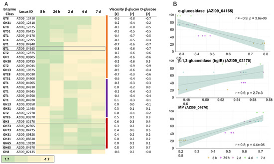 Expression of GHs and GTs in the cell lysate. (A) Heat map of the expressed enzymes over time. The three clusters of proteins are indicated by the color bar on the right (orange, purple, and red). Relative fold change of protein expression compared to the mean depicted by color intensity, as stated below the figure (a range between −1.7-fold and 1.7-fold). Correlation coefficient values with viscosity, β-glucan, and D-glucose are listed next to the specific GHs and GTs. (B) The correlation of the expression of α-glucosidase AZI09_04165, β-1,3-glucosidase (bglB) AZI09_02170, and the MP AZI09_04670 with viscosity, including correlation coefficient values (r) and p-values (p).