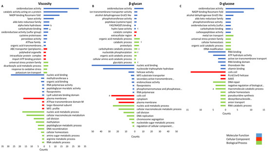 Gene set overrepresentation analysis of proteins correlating with (A) viscosity, (B) β-glucan content, and (C) D-glucose content. Top bar charts indicated the positively and bottom bar chart the negatively correlating proteins with corresponding GO terms (y-axis). The x-axis represents the gene counts. GO terms comprising proteins of interest are indicated by (a) GHs and GTs; (b) β-glucan-biosynthesis-associated proteins (other than GHs and GTs), and (c) moonlighting-associated protein enolase (AZI09_08765).