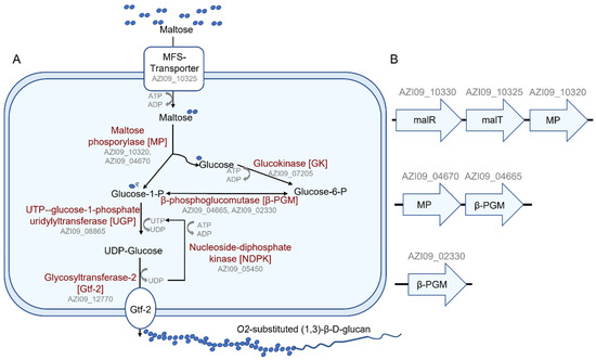 Pathways for the biosynthesis of β-glucan by L. brevis TMW 1.2112 from several mono- and disaccharides have been postulated [46]. With maltose as a sole energy source, the proteomic data were analyzed for enzymes related to this putative pathway. In summary, all proteins described in the putative pathway were identified within the cell lysate, and some were identified within the secretome (Figure 8A). Transporters for maltose uptake in LAB, e.g., the maltose ABC transporter or the MFS maltose transporter, have been described in Lactiplantibacillus (La.) plantarum or Fructilactobacillus (F.) sanfranciscensis, respectively [77,78]. Our analyses resulted in the MFS maltose transporter, MalT (AZI09_10325), expressed within the cell lysate and secretome (7 days). The ORF of MalT was next to the ORF of the MP (AZI09_10320) and the ORF of the transcriptional regulator MalR (AZI09_10330), resulting in one operon. These proteins were detected at all time points of the cell lysate and after 7 days within the secretome. In addition, the ORFs of the MP AZI09_04670 and β-PGM (AZI09_04665) could be associated with a second operon, and a second β-PGM (AZI09_02330) was also identified (Figure 8B). Two maltose operons were described for F. sanfranciscensis: one contains an MP (mapA) and β-PGM and is induced by the presence of maltose acting as a major catabolic enzyme, and the second includes, in addition to an MP (mapB) and β-PGM, a permease and epimerase. The mapB system is under the control of a constitutive promotor and a microorganism, and only the mapA system usually has a prolonged lag phase [79]. The cell growth of L. brevis TMW 1.2112 entered the exponential phase immediately without a lag phase, which could also be due to the faster utilization of the free amino acids of the CDM.