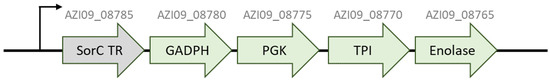 Operon of putative moonlighting proteins. GADPH (glyceraldehyde-3-phosphate dehydrogenase), PGK (phophoglycerate kinase), TPI (triose-phosphat isomerase), and enolase.