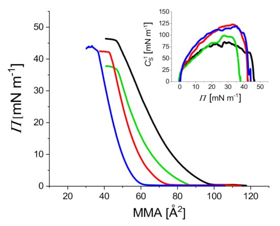 The surface pressure compression isotherms (Π–A) allowed the compressibility modulus to be determined (CS−1 = −A(dΠ/dA)T) [45,46,47].