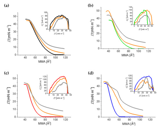Π–A isotherms of SM/POPC (a), SM/POPC/CHOL 10 mol% (b), SM/POPC/CHOL 30 mol% (c), and SM/POPC/CHOL 50 mol% (d) spread on the water subphase (black (a), green (b), red (c) and blue (d)) and the GOTCAB solution subphase with 8 (orange (a–d)) and 80 (gray (a–d)) mg L−1 GOTCAB. T = 20 °C. Insets: CS−1–Π dependency.