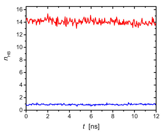 The MD calculations were carried out using the NAMD package [52] with periodic boundary conditions imposed on the system. Langevin thermostat and barostat were used to control the temperature and pressure, respectively. van der Waals interactions were switched off at 12 Å. Electrostatic energy was calculated with the PME method [53]. A time step of 1 fs was used in all simulations. TIP3P model was adopted for water [54]. The VMD software was also applied to visualize the trajectories and to compute selected properties, including hydrogen bond characteristics. It was assumed that the distance from the hydrogen donor (HD) atom to the hydrogen acceptor (HA) atom was less than or equal to 3 Å and that the HD-H-HA angle was not greater than 20 degrees.
