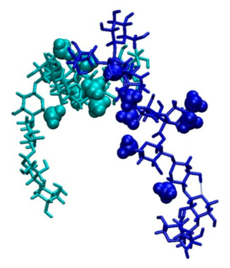 GOTCAB saponin dimer with monomers shown in blue and cyan, respectively. The aglycone CH3 groups are represented by balls dimensioned in proportion to the van der Waals radii. The dashed line represents an intramolecular HB.