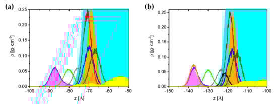 Figure 7 illustrates densities of the terminal hydrophobic CH3 groups in phospholipid lateral chains, hydrophilic PO4, N(CH3)3, and OH functional groups. Moreover, the location of C=C double bonds is shown. Independently of the system, the outspread of the hydrophobic parts of the lipids towards vacuum was almost the same. The maximum of the partial density plot of terminal CH3 groups of POPC (magenta area) and SM (violet line) in panel (a) were located in the same region, including the location of maxima. The same was true for the ternary system. An additional orange line representing the terminal CH3 groups of CHOL was exactly in the same place as the remaining two lines. The differences were more pronounced in the hydrophilic region. Here, the partial density plots of PO4 in POPC (orange area in both panels) shifted towards the water box interior compared to the SM PO4 groups (red line). The hydrophobic part of CHOL, represented by the black line in panel (b), was located at the interface. The same behavior was found in POPC N(CH3)3 and SM N(CH3)3 groups, with the former pushed further towards the water bulk. A similar trend was observed in the SM/POPC and SM/POPC/CHOL monolayers formed on pure water (Supplementary Materials, Figure S4).