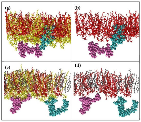To obtain a better understanding of the experimental measurements, molecular dynamics simulations were used [39,40,41,42], which allowed the properties of the model membranes and molecular interaction within the system containing GOTCAB molecules to be studied at an atomic level.