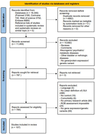 Supplementary Tables S1 and S2 show the study characteristics of the human and animal studies, respectively. All studies included women and female animals only. Of the human studies, SUI alone was investigated in 52 human studies [,,,,,,,,,,,,,,,,,,,,,,,,,,,,,,,,,,,,,,,,,,,,,,,,,,,], and SUI with the co-occurrence of POP in 23 studies [,,,,,,,,,,,,,,,,,,,,,,], of which three studies investigated both SUI and SUI with POP [,,], All animal studies focused on SUI alone [,,,,,,,,,,,,,,,,,,,,,,,,,,,,,,,,,,]. The animal studies used rats (Sprague-Dawley, Lewis, Wistar, and undefined strain) or mice (C57BL/6 strain). The age of the mice and rats used, if reported, ranged from six weeks to six months old. All rats and mice, if mentioned, were virgins or primiparous. SUI induction was mostly performed by vaginal dilatation with various diameters, objects, and durations of dilatation, and with or without bilateral ovariectomy and/or previous spontaneous delivery. Other methods were pudendal nerve crush or transection, electrocauterization, surgically opening of paravesical space, and surgically detaching urethra from the anterior wall. The timeline of the gene or protein expression assessment post-induction of SUI, if reported, ranged from one week until nine months.