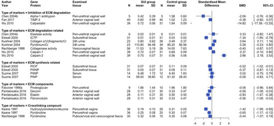 SUI is associated with an aberrant ECM metabolism, most likely resulting in a lower gene and protein expression of ECM macromolecules (collagen, elastin, proteoglycans) and crosslinking compounds, and altered degradation, when compared to controls. ECM metabolism is a complex process that continuously adjusts to new conditions based on mechanical cues and cell–cell interactions. The collective results and forest plot (Figure 3) indicated a higher expression of a number of ECM degradation-related markers and lower expression of inhibitors of ECM degradation in SUI, but their relative contribution and role in disturbing the ECM metabolism cannot be judged. Based on this systematic review, there is insufficient evidence to conclude that these markers are the main contributors to the lower expression of ECM macromolecules.