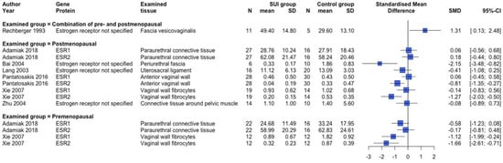 In addition to summarizing the data of studies without quantitative data, the forest plots were used to visualize differences in expression when comparing SUI subjects with controls. However, a pooled summary result of the calculated SMDs per examined gene/protein could not be determined, mainly because of the heterogeneity in the tissues examined, the low number of studies per examined gene/protein (as there was often data from only one study), and the different assay methods.