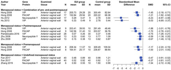Forest plot of neuron-specific marker-related protein expression in human studies. This forest plot shows differences in the protein expression of neuron-specific markers between patients with SUI and controls, subdivided per menopausal status group. Abbreviations: CI confidence interval, N number, SD standard deviation, SMD standardized mean difference, SUI stress urinary incontinence.