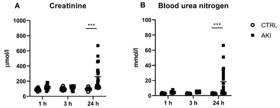 Neither plasma creatinine nor BUN were significantly higher in AKI vs. CTRL groups 1 h and 3 h (early) after injury induction (Figure 1). Both creatinine (p = 0.0001; Figure 1A) and urea (p = 0.001; Figure 1B) were significantly different between the CTRL and AKI animals 24 h after AKI induction. The plasma creatinine concentrations were approximately 2.5-times higher (96 ± 5 µmol/L in CTRL vs. 260 ± 37 µmol/L in AKI group, p = 0.0001), while the plasma urea concentration was approximately 7-times higher in AKI than in the corresponding CTRL group 24 h after induction (2.6 ± 0.1 mmol/L in CTRL vs. 18.3 ± 4.1 mmol/L in AKI group, p = 0.0001).