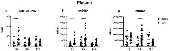One hour after the AKI induction, the total concentration of ecDNA in the plasma was significantly higher in the AKI group compared to the CTRL group (29 ± 11 ng/mL in CTRL vs. 73 ± 17 ng/mL in AKI group, p = 0.02). No significant differences between the groups were observed at the 3 h and 24 h time points (Figure 2A).