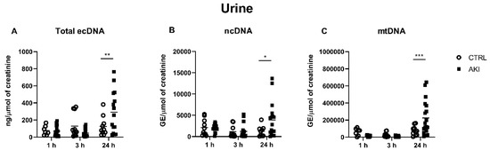 In line with the results found in the plasma, mtDNA reached higher concentrations than ncDNA in the urine. Concentrations of mtDNA in the CTRL did not differ from those in the AKI group, 1 h and 3 h after the model induction. At 24 h after the induction, the concentration was significantly higher in the AKI group (74,643 ± 17,507 GE/µmol of creatinine in CTRL vs. 224,942 ± 47,018 GE/µmol in AKI group, p = 0.0009, Figure 3C).