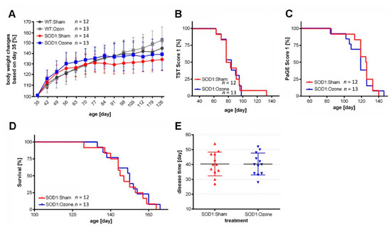 Clinical assessment of the study mice. (A) Changes in body weight normalized to 100% at P35. Values represent mean ± S.D. p = n.s. between groups, two-way ANOVA with Tukey correction. (B) Tail suspension test (TST) evaluating the beginning of motor deficits in the hind limbs (score = 1), p = 0.968, n.s., Log-Rank test. (C) Paw grip endurance test (PaGE) evaluating motor strength and endurance (score = 1), p = 0.672, n.s., Log-Rank test. (D) Survival analysis, p = 0.565, n.s., Log-Rank test. (E) Scatter plot (mean ± S.D.) of disease duration in days from first day of treatment to end-stage in sham- or ozone-treated SOD1G93A mice. p = 0.979, n.s., unpaired t-test.