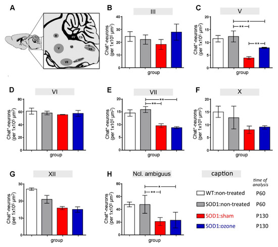 To evaluate the extent of neuronal degeneration in the core motor nuclei of the brainstem (Figure 2A), the number of ChAT-immunoreactive (ir) neurons was counted in these areas and compared between the experimental groups. Comparisons were made between WT and SOD1G93A mice at P60, together with sham- and medical ozone-treated SOD1G93A mice at P130. No differences in the numbers of ChAT-ir neurons between groups were observed for the oculomotor (III, Figure 2B; WT P60 = 24.65 ± 3.76, SOD1 P60 = 22.30 ± 3.64, SOD1 sham P130 = 18.44 ± 3.86, SOD1 ozone P130 = 28.16 ± 6.36), the abducens (VI, Figure 2D; WT P60 = 60.91 ± 4.67, SOD1 P60 = 57.95 ± 2.91, SOD1 sham P130 = 55.21 ± 0.16, SOD1 ozone P130 = 57.23 ± 4.64), and the dorsal nucleus of the vagus nerve (X, Figure 2F; WT P60 = 14.93 ± 2.44, SOD1 P60 = 12.76 ± 4.60, SOD1 sham P130 = 7.99 ± 1.53, SOD1 ozone P130 = 9.10 ± 0.62). In the hypoglossal nucleus (XII, Figure 2G; WT P60 = 27.23 ± 0.75, SOD1 P60 = 21.19 ± 3.31, SOD1 sham P130 = 15.99 ± 0.96, SOD1 ozone P130 = 15.13 ± 1.58), only trends toward decreasing numbers of ChAT-ir neurons in the two SOD1G93A groups at the late stage of disease were visible. Robust effects of neuronal degeneration between P60 and P130 SOD1G93A mice were seen in the trigeminal motor nucleus (V, Figure 2C; WT P60 = 11.54 ± 1.27, SOD1 P60 = 12.41 ± 2.17, SOD1 sham P130 = 3.90 ± 0.57, SOD1 ozone P130 = 7.90 ± 0.22), in the facial nucleus (VII, Figure 2E; WT P60 = 14.51 ± 1.26, SOD1 P60 = 15.84 ± 1.16, SOD1 sham P130 = 9.54 ± 0.75, SOD1 ozone P130 = 8.80 ± 0.37), and in the ambiguus nucleus (Figure 2H; WT P60 = 50.37 ± 0.91, SOD1 P60 = 46.98 ± 2.74, SOD1 sham P130 = 27.67 ± 2.83, SOD1 ozone P130 = 21.25 ± 4.23). Interestingly, an attenuating effect of medical ozone on motor neuron degeneration was observed in the trigeminal motor nucleus only (p = 0.0025).
