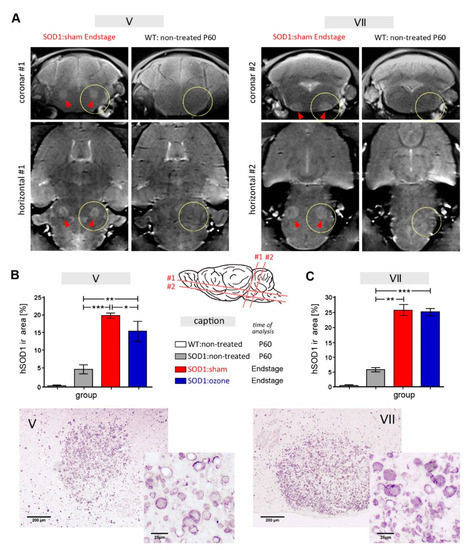 A characteristic feature of human SOD1G93A-related neuropathology in the mouse model used is the appearance of intraneuronal vacuoles, which are most likely caused by expansion of the intermembrane space of mitochondria [20,21,22]. Since these vacuoles are fluid-filled, they are potentially accessible in live animals using T2-weighted MRI analysis. Because of their sizes, the trigeminal (Figure 3A) and facial (Figure 3B) motor nuclei were readily detectable in SOD1G93A mice at the end stage, when compared to the WT. The level of vacuolization of these ALS-vulnerable nuclei was quantified with anti-human SOD1 antibodies in immunohistochemical analysis [23]. As expected, human SOD1-related vacuolization was already observed at P60 (V: 4.60 ± 1.21% area, VII: 5.50 ± 0.75%), and a strong increase in area covered by human SOD1 immunoreactivity was evident for both the trigeminal (Figure 4B, 19.70 ± 0.82, p = 0.0002 when compared to P60) and facial (Figure 4C, 25.50 ± 2.07, p = 0.0026 when compared to P60) nuclei in sham-treated SOD1G93A mice at the disease end-stage. Human SOD1-related vacuolization was attenuated after medical ozone treatment in the motor trigeminal nucleus at end-stage (15.30 ± 2.81) when compared to sham treatment (p = 0.03) but not in the facial motor nucleus (25.00 ± 1.00, p = 0.42).