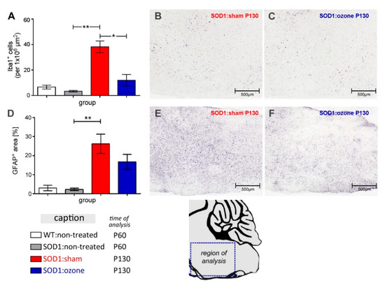 To assess the extent of brain innate inflammation, immunohistochemical staining for Iba1 was performed to detect reactive microgliosis, and for GFAP to detect astrogliosis. Quantification of microglia cells in the brain stem revealed no difference between the WT and SOD1G93A animals at P60 (Figure 4A, 0.67 ± 0.25 vs. 0.35 ± 0.1, p = 0.16). A significant increase in the number of Iba1-ir cells was observed in sham-treated SOD1G93A animals at P130 (Figure 4B, 3.82 ± 0.80) when compared with P60 SOD1G93A animals (p = 0.0009). In contrast, animals treated with medical ozone (1.21 ± 0.64) showed a much smaller increase in Iba1-ir cells than sham-treated animals at P130 (p = 0.02). Even at this advanced disease stage, microgliosis only slightly increased in animals treated with medical ozone compared to SOD1G93A animals at P60 (p = 0.31). To determine the extent of astroglia hypertrophy by GFAP immunohistochemistry, the proportion of the GFAP-ir area was determined in relation to the total area of each brain region analyzed (Figure 4D). While the GFAP-ir area was found not to increase at P60 in SOD1G93A animals when compared to the WT (3.01 ± 2.48 vs. 2.28 ± 1.07, p = 0.68), pronounced astrogliosis was measured in the sham-treated SOD1G93A animals in the advanced disease stage at P130 (Figure 4E, 26.21 ± 8.79, p = 0.0047). In contrast, animals treated with medical ozone displayed an attenuated astrogliosis at P130 (Figure 4F, 16.75 ± 5.61); however, this was neither significantly reduced when compared with the same-aged sham-treated SOD1G93A animals (p = 0.14) nor significantly increased when compared with the non-treated SOD1G93A animals at P60 (p = 0.16).