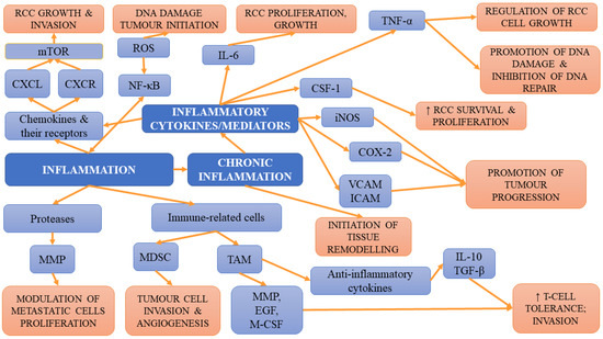 In lean individuals, white adipose tissue containing invariant natural killer T-cells, alternatively activated macrophages, regulatory T-cells, eosinophils and T-helper type 2 cells, together with adipose cells, controls energy balance and exerts anti-inflammatory activity [97]. However, the increase in BMI is associated with adipocyte death due to hypertrophy, which results in the conversion into inflamed-WAT rich in pro-inflammatory cytokines, such as TNF-α, which subsequently affect systemic homeostasis. Such transformation favours cancer onset and progression via the TNF-α-induced release of cytokines and angiogenic factors as well as anti-apoptotic factors such as (B-cell CLL/lymphoma 2 (BCL-2)) and cyclin D1 and cyclin E in cancer cells [52,98,99]. Chronic inflammation is one of the hallmarks of tumorigenesis [100]. Chronic overload of lipids and nutrients, which is observed in obese individuals, can result in the development of an inflammatory state within adipose tissue, leading to many pathologies, including diabetes mellitus and metabolic syndrome [101,102]. However, the development of these conditions is preceded by the impairment of immunity and immune responses, which, in the long-term perspective, may favour the initiation and progression of tumours [103]. Adipose tissue is a rich source of immune cells, especially macrophages, which can, under favourable conditions, contribute to the development of cancer [76]. Adipose tissue of lean individuals is capable of releasing a variety of anti-inflammatory cells, such as T helper type 2 (Th2) T cells, alternatively activated (M2) macrophages, and regulatory T-cells [104]. However, in obese patients, the increase in the amount and dimensions of adipocytes is associated with the secretion of inflammatory factors, adipokines and cytokines (leptin, monocyte chemoattractant protein 1 (MCP-1), TNF-α, IL-6). Moreover, the activation of T helper type 1 (Th1) cells is observed. Th1 and cluster of differentiation 81 (CD81) T-cells were demonstrated to release high amounts of interferon γ (IFN-γ), leading to the worsening of inflammation within adipose tissue. Apart from the aforementioned changes, obesity also activates and upregulates intracellular pathways (signal transducer and activator of transcription 3 (STAT3), nuclear factor kappa-light-chain-enhancer of activated B-cells (NF-κB), COX-2) that are responsible for the aggravation of inflammation and cellular proliferation but also for blocking the apoptosis [105,106]. The presence of elevated concentrations of serum C-reactive protein (CRP), IL-6, TNF-α, leukocyte and higher neutrophil count in obesity-induced chronic inflammation results in the accumulation of macrophages in the adipose tissue of obese individuals [107,108,109]. The proliferation of macrophages leads to macrophage accumulation in the course of obesity development and is followed by greater migration and aggravated accumulation of macrophages in adipose tissue (mediated by the CCL2/IL-1β/C-X-C motif chemokine ligand 12 (CXCL12) signalling pathway) [110,111]. Furthermore, obesity stimulates the retention of macrophages in adipose tissue [112]. Both macrophages recruited via MCP-1, TNF-α and the increase in IFN-γ concentrations in adipose tissue contribute to the switch from the M2 pro-repair state into the activated/inflammatory (M1) macrophage phenotype associated with the enhanced expression of major histocompatibility complex (MHC) class II and pro-inflammatory cytokines [113]. The cJun NH2-terminal kinase, which is necessary for such polarization, also plays an important role in obesity-related inflammation and insulin resistance [114]. The results of studies have revealed that in obese patients, ECM displays a greater capability to polarize macrophages to the M2-like phenotype compared to ECM from lean patients [115]. According to Springer et al. [87], obesity-associated interstitial fibrosis, which stimulates a macrophage phenotype switch into macrophages similar to tumour-associated macrophages (TAM), may partly explain the link between obesity and cancers. Activated macrophages released large amounts of inflammatory cytokines, e.g., COX-2, TNF-α, IL-6 and plasminogen activator inhibitor-1 (PAI-1), aggravating the state of chronic inflammation and enhancing insulin resistance and the risk of cancer initiation [116]. Moreover, they were found to stimulate both stromal vascularisation and angiogenesis, which contribute to tumour progression [117]. TAMs that have an M2-like phenotype will promote tumour growth and hinder antitumor immune cells [118,119]. The release of cytokines by macrophages is associated with enhanced tumour growth, malignancy, ECM remodelling as well as angiogenesis. Through the release of matrix metalloproteinases and cathepsins degrading extracellular matrix proteins, TAMs also favour tumour progression and invasion [119]. The production of vascular endothelial growth factor and TGF-β by TAMs enables the angiogenesis necessary for tumour progression [120]. Not only macrophages but also adipocytes release inflammatory cytokines affecting cancer cell inflammation. Inflammation facilitates the EMT, which, in turn, enhances both the metastatic potential of tumour cells and genomic instability [105]; it was demonstrated not only to stimulate cancer cell survival and progression but also to limit adaptive immunity. Cardillo et al. [121] demonstrated that levels of interleukin-10 protein were higher in more advanced TNM stage (pT3) tumours. Moreover, they suggested that IL-6 and IL-10 and heat shock protein 90 (HSP-90) may be useful markers of the development and progression of renal-cell carcinomas. In turn, TNF-α was found not only to stimulate the proliferation and metastasis of RCC cells but also to be involved in the glycogen synthase kinase 3 beta (GSK3β)-mediated epithelial–mesenchymal transition in RCC [122]. In obesity, the enhanced formation of ROS, together with pro-infla