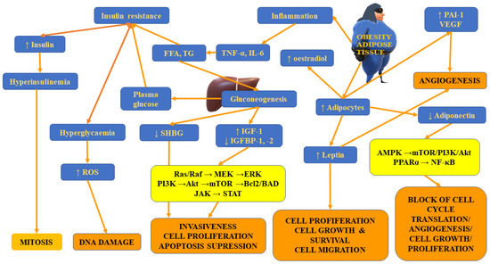 Excess caloric intake accompanied by adipocyte hypertrophic growth results in disturbed insulin sensitivity and cellular stress. The rise in glucose levels in obese individuals facilitates the formation of the pro-tumour microenvironment [106]. Insulin resistance, observed frequently in obese individuals, is associated with an early rise in insulin-like growth factor 1 (IGF-1) levels and IGF-1 receptors in WAT and other tissues [126]. Diminished synthesis of adiponectin in obese individuals is associated with the development of insulin resistance, which then results in hyperinsulinemia [127,128]. Insulin, IGF1 and TNF-α have been demonstrated to negatively affect the production of sex-hormone-binding globulin (SHBG), which is the crucial carrier of testosterone and oestradiol in the plasma, thus contributing to the rise in sex steroid bioavailability and the potential increase in the risk of tumours [129,130]. Prolonged and chronic hyperinsulinemia decreases the release of insulin-like growth factor (IGF)-binding protein-1 and 2 (IGFBP1 and 2), thus contributing to the increase in the levels of bioavailable IGF1, which, in consequence, induces cell proliferation and inhibits apoptosis, favouring the formation of tumours [43,131]. Another study demonstrated that despite being capable of stimulating cancer growth, insulin, which is one of the vital anabolic hormones, is not carcinogenic [132].