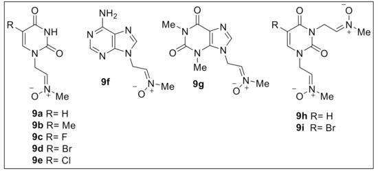 With these ideas in mind, several years ago a project was started to target the synthesis and biological evaluation of new nitrones as potential drugs for cerebral ischemia treatment [17,18]. As a result, we identified various mono-nitrones derived from (hetero)aromatic aldehydes (5) [19] or steroids (6) [20], bis-homonitrone 7 [21], and tris-homonitrone 8 [22] (Figure 1), showing high and consistent neuroprotective properties. On the other hand, some of us have studied the antiviral activity of pyrimidine-containing nitrones 9a–e and the purine-containing analogues 9f, g (Figure 2). Although none of the compounds were active, they appeared to be non-cytotoxic toward tested cell lines [23,24,25]. These observations inspired us to study the neuroprotective and antioxidant properties of nucleic acid base-derived mono-nitrones 9a–g as well as bis-nitrones 9h, i (Figure 2). As a result of this work, we have identified nitrones 9a, c, f, g as the most efficient neuroprotective and antioxidant nucleobase derived nitrones.