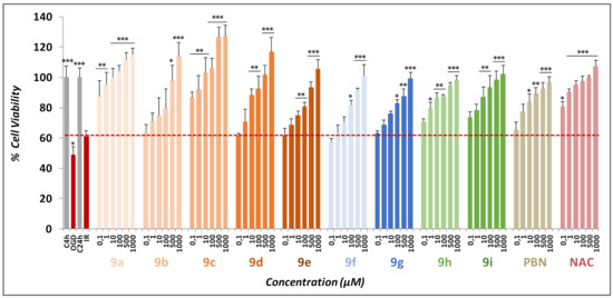 Neuroprotective effect of nitrones 9a–i, α-phenyl-N-tert-butylnitrone (PBN), and N-acetyl-L-cysteine (NAC) on SH-SY5Y human neuroblastoma metabolic activity after OGD treatment (4 h) followed by OGR (24 h) (IR). Bars show percent cell viability at the indicated concentrations of nitrones 9a–i, PBN, and NAC. Values represent the mean ± SEM of three experiments, each one performed in triplicate. The statistics compare the differences with IR condition alone (red dotted line) at * p < 0.05, ** p < 0.01, and *** p < 0.001 (one-way ANOVA, followed by Holm−Sidak analysis as a test post hoc).
