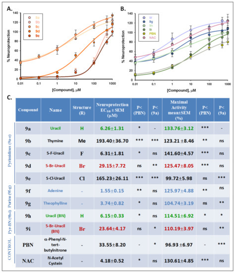 The analyses of the concentration-response curve data (Figure 10A,B) and calculations of EC50 and the highest antioxidant activities of nitrones 9a–i, PBN, and NAC are shown in Figure 10C. The EC50 values, from lowest to highest, follow the order: 9g ≤ 9h ≤ 9a ≤ 9b ≤ NAC ≤ 9i ≤ 9f ≤ 9c ≤ PBN < 9e < 9d, with nitrones 9g, 9h, and 9a having the highest potency and PBN and nitrones 9e and 9d having the lowest potency. There were also significant differences in the maximal neuroprotective activity of the different nitrones, with values from highest to lowest as follows: 9h ≥ 9a ≥ NAC ≥ 9d ≥ 9a ≥ 9f ≥ 9c ≥ PBN ≥ 9e. In other words, all the nitrones had a very high maximal activity, with nitrones 9h and 9a having the highest potency and PBN and nitrone 9e having the lowest potency, as was the case for cell viability experiments with XTT. However, despite these small differences in the EC50 values of the antioxidant effect, the application of statistical tests for comparison shows that only nitrones 9d, e, with Br and Cl substituted uracil as nucleobase, respectively, were significantly higher than PBN and nitrone 9a. As for the maximal antioxidant capacity, only nitrones 9a, d, h, I, and NAC were significantly higher than PBN and only nitrones 9c, e, g, and PBN, significantly lower than nitrone 9a, being those of NAC and nitrone 9h significantly higher than this nitrone.