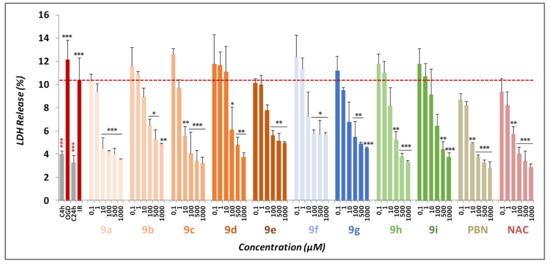 As shown in Figure 8, nitrones 9a–i, as well as PBN and NAC, did not show any neurotoxic effects at basal level.