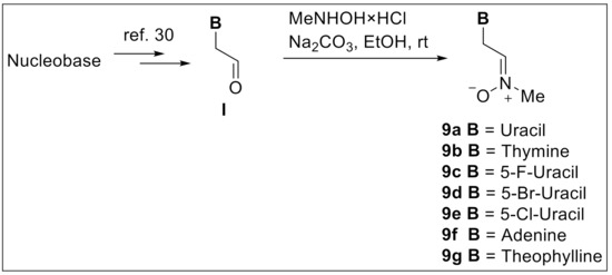 Based on our previous experience with the known nitrones 9a–d, 9f [23,24], and 9g [25] as well as new nucleobase-derived mono-nitrone 9e, the bis-nitrones 9h, i were prepared following the reactions shown in Scheme 1 and Scheme 2, respectively (Materials and Methods). Thus, the aldehydes of type I (Scheme 1) and the bis-aldehydes 10 and 11 (Scheme 2) were obtained directly from their respective nucleobase via mono- and dialkylation with bromoacetaldehyde diethyl acetal and subsequent acetal hydrolysis according to the literature protocol [26]. For the transformation of mono- and bis-aldehydes into the respective nitrones, 9a–g and 9h, i, the appropriate amounts of MeNHOH-HCl/Na2CO3 were used (2 eq. for the synthesis of 9a–g and 4 eq. for 9h, i). According to our previous observations, as reported earlier, all nucleobase-derived nitrones 9a–i in D2O, DMSO-d6, and methanol-d4 solutions exist as single isomers [23]. In the NMR spectra of the corresponding nitrone 9a–i, only signals related to the one isomer were observed (Materials and Methods). The analysis of literature data for other acyclic nitrones [27] allowed us to conclude that nitrone 9 exists as Z-isomers, although the corresponding signals from other E-isomers for comparison were never observed.