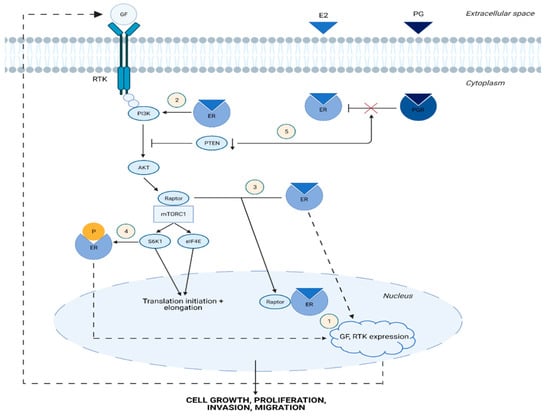 The PI3K/AKT/mTOR pathway is involved in estrogen signal transduction, thus contributing to the adverse effects of abnormal estrogen levels on endometrial homeostasis [,]. In fact, estrogen receptors (ERs) induce the expression of several upstream regulators of the PI3K/AKT/mTOR pathway, such as receptor ligands, receptor tyrosine kinases (RTKs), and signaling adaptors []. Furthermore, ERs can stimulate the PI3K/AKT/mTOR pathway not only by acting as transcription factors but also by physically interacting with effectors that are involved in the cascade. For example, estrogen bound ERα directly binds to the p85α regulatory subunit of PI3K and promotes its phosphorylation []. In addition, activated ERα attaches to Raptor, causing the translocation of the latter to the nucleus []. Other than that, estrogen induces PI3K signaling via stimulation of insulin-like growth factor 1 receptor (IGF-1R) []. In reverse, the mTOR pathway can also promote ER signal transduction. Specifically, mTORC1 leads to ERα phosphorylation and activation via S6K1 [,].