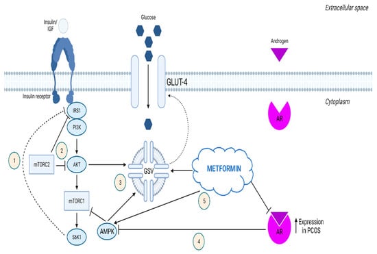 mTOR signaling in PCOS-induced endometrial hyperplasia Glucose metabolism in the uterus is of essential importance for normal endometrial function. Hyperinsulinemia and insulin resistance are major disorders involved in the pathogenesis of PCOS and are believed to contribute to the development of EH in women with this condition. (1) Normally, S6K1 phosphorylates IRS1, thereby preventing the association of IRS1 with the insulin receptor. This negative feedback mechanism desensitizes and protects the cell from further insulin stimulation. When mTORC1 is chronically activated, for example, due to excessive glucose consumption, the sustained downstream stimulation of S6K1 increases IRS1 phosphorylation. This decreases its responsiveness to insulin, thus rendering the cell insulin resistant []. (2) mTORC2 influences insulin sensitivity by impairing IRS1 and AKT function. (3) GLUT-4 expression and translocation to the plasma membrane are enhanced by AMPK and AKT, respectively [,]. (4) High androgen levels in PCOS restrain apoptosis and increase the proliferative potential of endometrial cells by stimulating mTOR signaling via AMPK inactivation. (5) Metformin restrains EH by suppressing the mTOR pathway through AMPK stimulation. It has also been shown that metformin increases GLUT-4 and decreases AR levels in the endometrium, probably via the mTOR pathway []. IGF, insulin-like growth factor; IRS1, insulin receptor substrate 1; PI3K, phosphatidylinositol-3-kinase; AKT, protein kinase B; mTORC2, mammalian target of rapamycin complex 2; mTORC1, mammalian target of rapamycin complex 1; S6K1, p70S6 kinase 1; AMPK, adenosine monophosphate (AMP)-activated protein kinase; GLUT-4, glucose transporter type 4; GSV, GLUT-4 storage vesicle; AR, androgen receptor3. Graphic created with BioRender.com.
