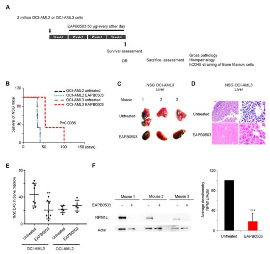 EAPB0503 prolongs survival and attenuates AML pathological features in NPM1c AML xenograft NSG mice. (A) Eight-week-old NSG mice were injected with 3 million OCI-AML2 or OCI-AML3 cells intravenously (12 mice per cell line per condition). After 1 week post injection, EAPB0503 (2.5 mg/kg, 50 µg/mouse) was intraperitoneally administered every other day, for a total period of 3 weeks. At the end of week 3, one group of six mice per condition was monitored for survival. The remaining six mice per condition were sacrificed for gross pathology, histopathology and hCD45 staining on the flushed bone marrow cells. (B) Kaplan–Meier overall survival of untreated NSG mice injected with OCI-AML2 or OCI-AML3 (n = 6, black line and gray line, respectively) or treated with EAPB0503 (n = 6, blue line and red line, respectively). The t-test was performed to validate significance. P-values less than 0.05 were considered significant. (C) Gross pathology of livers from three representative untreated (upper panel) or EAPB0503-treated (lower panel) OCI-AML3 xenograft mice. (D) Histological analysis (H&E stain) of the liver of a representative untreated (upper panel) or EAPB0503 treated (lower panel) OCI-AML3 xenograft mouse (left panel, magnification 10×, right panel, magnification 40×). (E) Graph showing the hCD45 PerCP percentage in untreated or in EAPB0503 treated xenograft mice injected with OCI-AML3 or OCI-AML2 (n = 6 per condition). (F) Western blot of NPM1c in BM cells extracted from NSG mice xenografted with OCI-AML3 (three representative mice out of six are shown), after in vivo treatment with EAPB0503. Histogram shows the average densitometry of NPM1c/Actin of the 3 representative mice. The t-test was performed to validate significance. ** and *** indicate p values ≤ 0.05; 0.01 and 0.001, respectively. p-values less than 0.05 were considered significant.