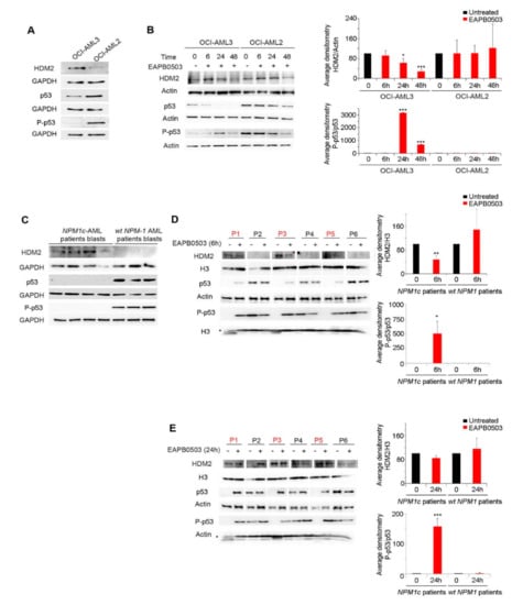 We have previously demonstrated that EAPB0503 induces apoptosis exclusively in the NPM-1c OCI-AML3 cell line, 48 h after in vitro treatment, following a substantial upregulation of total p53 protein levels, and its phosphorylated form P-p53 []. We expanded our results to primary blasts from patients with wt-NPM1 or NPM1c AML. Since the human double min 2 protein (HDM2) is a ubiquitin E3 ligase and a major endogenous negative regulator of p53, which leads to its proteasomal degradation [], we investigated the effect of EAPB0503 on HDM2. First, our results indicate that HDM2 basal protein levels are higher in OCI-AML3 expressing NPM1c, as compared to OCI-AML2 expressing wt-NPM1 (Figure 2A). These observed higher HDM2 levels were consistent with lower p53 protein levels and unphosphorylated p53 in OCI-AML3 (Figure 2A). Treatment of OCI-AML3 with EAPB0503 revealed a gradual decrease of HDM2 protein levels reaching significance at both 24 h and 48 h post treatment (p value = 0.0216 and 0.0002 respectively). The maximum downregulation was obtained selectively in OCI-AML3 cell line, at 48 h post treatment (p < 0.001). This decrease was paralleled with a sharp and significant activation of the p53 pathway, as demonstrated by the ratio P-p53/p53 at the same time points (p value = 0.0001 and 0.0002 respectively). Notably, the activation of the p53 pathway reached its maximum at 24 h post treatment, exclusively in OCI-AML3 cells with EAPB0503 (p < 0.001), with no significant effect in OCI-AML2 cell line (Figure 2B). Interestingly, basal levels of HDM2, p53 and P-p53 in primary blast from 3 out of 4 NPM1c AML patients exhibited a similar protein expression profile as that seen in OCI-AML3 (Figure 2C). Ex vivo treatment of these primary blasts with EAPB0503 led to an early activation of the p53 pathway, as compared to OCI-AML3. Indeed, 6 h post treatment with EAPB0503, a significant decrease in the expression of HDM2 protein (p value = 0.0065) accompanied by a significant activation of the p53 pathway (p value = 0.021) were observed (Figure 2D). A sharp and significant activation of this pathway was sustained after 24 h post treatment with EAPB0503, selectively in primary blasts from NPM1c AML patients (Figure 2E). Collectively, these results demonstrate that NPM1c inhibits P-p53 concomitant to an upregulation of the p53 ubiquitin ligase HDM2, presumably inhibiting apoptosis and conferring survival properties to these cells. Targeting NPM1c by EAPB0503 activates the P53 pathway and downregulates HDM2, hence orchestrating the pro-apoptotic activity and inducing apoptosis in EAPB0503 treated NPM1c AML cells.