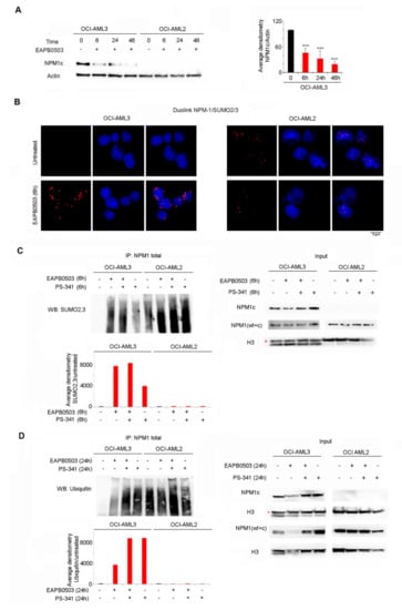 We then examined the effect of EAPB0503 on NPM1 post-translational modifications, namely SUMOylation and ubiquitylation. We used the proximity ligation Duolink assays (PLA) to assess the endogenous SUMO2/3 conjugation with NPM1 in OCI-AML3 and OCI-AML2 cells. Remarkably, in OCI-AML3 cells, conjugation between SUMO2/3 and NPM1 was not detected in untreated cells, while this conjugation was observed in OCI-AML2. Importantly, 6 h of treatment with EAPB0503 restored SUMO2/3-NPM1 conjugation in OCI-AML3 cells (Figure 3B). Similar results were obtained using the immunoprecipitation assay. Indeed, we could not detect basal SUMOylation levels of NPM1 in untreated OCI-AML3 (Figure 3C), demonstrating that SUMOylation levels are altered in NPM1c expressing cells. Furthermore, 6 h of treatment with PS-341 partially restored NPM1 SUMOylation while 6 h of treatment with EAPB0503 alone or combined with the proteasome inhibitor PS-341 substantially increased NPM1 SUMOylation in these cells (Figure 3C). Similar to SUMOylation, basal levels of NPM1 ubiquitylation were not detected in OCI-AML3 (Figure 3D), underpinning an effect of these two post-translational modifications on the leukemogenesis of NPM1c AML. Importantly, 24 h post treatment with EAPB0503 markedly restored NPM1 ubiquitylation and this effect was further enhanced following treatment with PS-341 alone or combined with EAPB0503 (Figure 3D). Altogether, our results indicate that NPM1c expressing cells exhibit altered SUMOylation and ubiquitylation profiles, potentially contributing to survival of leukemic blasts. Moreover, EAPB0503 could revert these post-translational modifications indicating that EAPB0503-induced NPM1c downregulation is secondary to oncoprotein degradation.