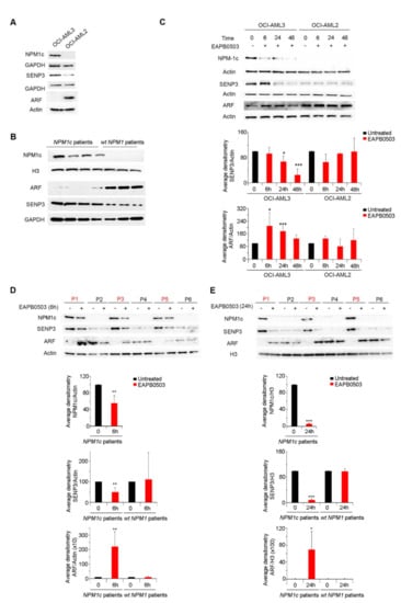 Under physiological conditions, NPM1 is involved in ribosomal biogenesis through a balance between SENP3 and ARF []. Indeed, an interplay between NPM1, SENP3 and ARF happens via cycles of SUMOylation/deSUMOylation to induce ribosomal biogenesis. It is well documented that ARF SUMOylates NPM1 prohibiting ribosomal biogenesis, while SENP3 deSUMOylates NPM1 switching ribosomal biogenesis on [,]. In NPM1c AML cells, basal ARF levels are very low [,], due to NPM1c failure to stabilize and retain ARF in the nucleolus. We first screened the effect of NPM1c on the basal levels of SENP3 and ARF in NPM1c cell lines and in primary blasts from NPM1c AML patients. Strikingly, SENP3 protein levels were particularly upregulated in all screened NPM1c, but wt-NPM1 expressing cells (Figure 4A,B), presumably explaining the low basal SUMOylation levels in these cells (Figure 3C,D). Remarkedly, treatment with EAPB0503 induced an antagonistic effect on SENP3 and ARF proteins. Indeed, a gradual and significant decrease of SENP3 expression was obtained following 24 h and reached less than 20% after 48 h of treatment of OCI-AML3 with EAPB0503 (p values = 0.033 and 0.001 respectively) (Figure 4C). This decrease was accompanied with an upregulation of ARF protein levels at as early as 6 h (Figure 4C). Similar results were obtained on primary blasts from three NPM1c AML patients following ex vivo treatment with EAPB0503 as compared to primary blasts from wt-NPM1 AML patients. Indeed, a significant decrease in SENP3 levels (p value = 0.01) concomitant with a sharp and significant increase in ARF protein levels was obtained as early as 6 h post treatment with EAPB0503 (Figure 4D), and this effect was sustained at 24 h post treatment with this drug (p value = 0.0003) (Figure 4E). Collectively, these results presumably indicate that NPM1c upregulates SENP3 and downregulates ARF, to sustain an NPM1 de-SUMOylation profile, which induces ribosomal biogenesis and contributes to leukemogenesis. Moreover, treatment with EAP0503 induced SUMOylation of NPM1c, following upregulation of ARF, and downregulation of SENP3, presumably to inhibit ribosomal biogenesis in these cells.