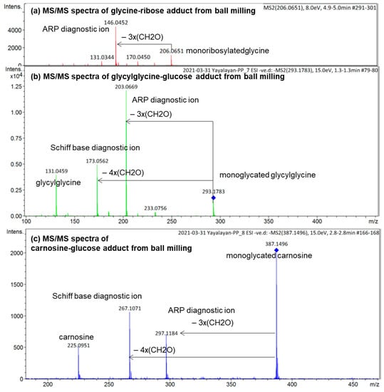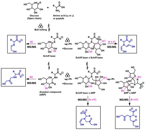 - Xing, H.; Yaylayan, V. Mechanochemical generation of Schiff bases and Amadori products and utilization of diagnostic MS/MS fragmentation patterns in negative ionization mode for their analysis. Carbohydr. Res. 2020, 495, 108091. [Google Scholar] [CrossRef] [PubMed]