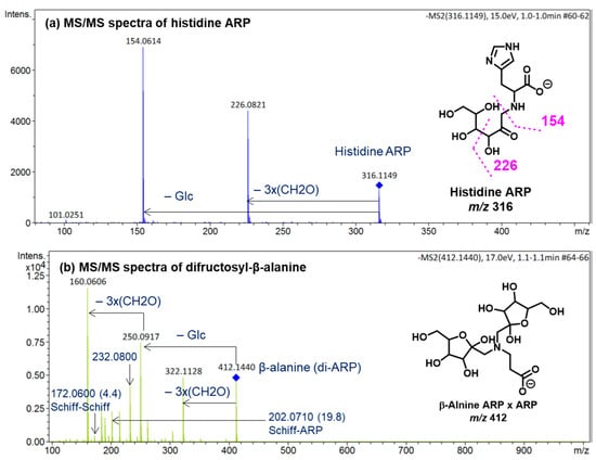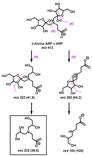 - Hau, J.; Devaud, S.; Blank, I. Detection of Amadori compounds by capillary electrophoresis coupled to tandem mass spectrometry. Electrophoresis 2004, 25, 2077–2083. [Google Scholar] [CrossRef] [PubMed]