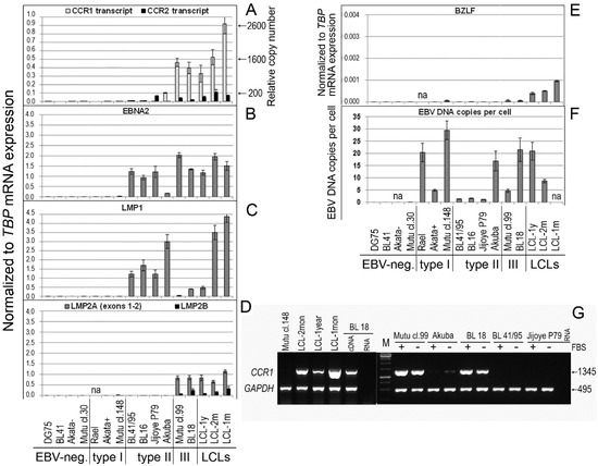 The mRNA expression levels of the CCR1, CCR2, CCR3, and CCR5 genes and the EBV genes, EBNA2, LMP1, LMP2A, LMP2B, and BZLF1, were assessed using real-time RT-PCR with the PerfeCTa SYBR Green FastMix (Quanta BioSciences Inc., Beverly, MA, USA) and the CFX96 Touch Real-Time PCR detection system (Bio-Rad Laboratories Inc., Richmond, CA, USA). The mRNA expression levels of the genes of interest were normalized to the mRNA expression levels of the housekeeping gene TBP (encoding TATA box-binding protein). The presence of the CCR1 open reading frame (ORF) transcript was determined using RT-duplex PCR performed with two pairs of primers flanking the CCR1 ORF and matching the housekeeping gene GAPDH (glyceraldehyde-3-phosphate dehydrogenase). We previously described the real-time RT-PCR procedure, the RT-duplex PCR protocol, and the corresponding primers in prior publications [3,30]. The EBV-encoded EBNA2, LMP1, and BZLF1 (exon 2/exon 3) transcripts were assessed using previously reported primers [34]; the EBV type 2 EBNA2 (in Jijoye P79 and BL16) and LMP2A (exon 1/exon 2 and exon 1/exon 3) transcripts were measured using primers described by Bell and coauthors [35]; and the LMP2B primers were described in a report by Fox and coauthors [36].