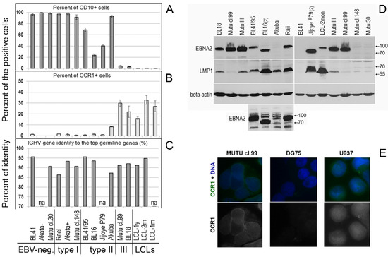 Phenotype of the Burkitt lymphoma cell lines. The percentages (%) of CD10-positive (A) and CCR1-expressing (B) cells were obtained using flow cytometry analysis. Annexin V-stained (apoptotic) and autofluorescent cells were omitted from the analysis. The presented data are from at least two independent experiments and are shown as the mean with the SD. (C) The IGHV gene identity (%) to the top germline genes was defined using the NCBI IGBLAST Tool. (D) EBNA2 and LMP1 protein expression in the type II and type III BL cell lines was assessed using immunoblotting of cell lysates and specific antibodies; the human beta-actin protein was probed as the loading control. The Raji and Mutu III BL type II cell lines served as the positive control (Table S1). All clones of the Mutu cell line are derivatives of an early-passage BL cell line [14]. BL41 is an EBV-negative cell line. A small panel, the same immunoblot with prolonged exposure, shows the EBNA2 protein in the cell lines BL41/95, BL16, Akuba, and Raji. (E) Immunofluorescent staining of CCR1 is shown in cells of the type III BL cell line Mutu cl.99 and human myeloid histiocytic lymphoma cell line U937, used as the positive control; in DG75, the EBV and the CCR1 transcript negative BL cell line, the CCR1 immunofluorescent signal was not observed.