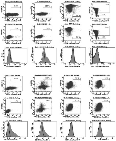 However, in Akuba cell line (the early passage type II BL cell line), only a small fraction of cells (~8.4%) carried CCR1. Cell surface expression of CCR1 was not detected in the CD10-positive and the EBV-negative (DG75, BL41, Akata-, Mutu cl.30), EBV-positive type I (Rael, Akata+, Mutu cl.148), or EBV-positive type II (BL41/95, BL16, Jijoye P79) BL cell lines (Figure 2A,B and Figure 3). We did not detect CCR2 on the cell surface of the LCL cells nor BL cells after serum deprivation. Nevertheless, using the same mouse monoclonal anti-CD192-Alexa Fluor 647 antibodies, we demonstrated the cell-surface expression of CCR2 on monocytes and B lymphocytes in PB of patients with rheumatoid arthritis [24] and patients with chronic lymphocytic leukemia [25].