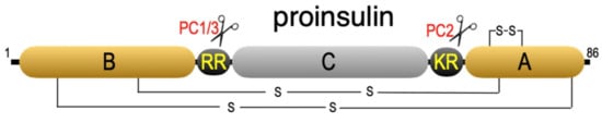 - Clark, J.L.; Steiner, D.F. Insulin biosynthesis in the rat: Demonstration of two proinsulins. Proc. Natl. Acad. Sci. USA 1969, 62, 278–285. [Google Scholar] [CrossRef] [PubMed]