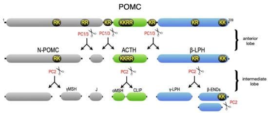 POMC. Shown are the processing steps that occur in the pituitary anterior lobe and neurointermediate lobe. The sites cut by proprotein convertases PC1/3 and PC2 are shown. For a recent review, see [].