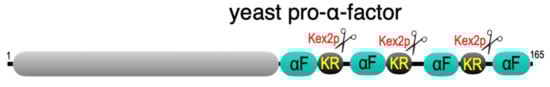 Yeast pro-α-mating factor. Shown are the four cryptic α-factor (αF) peptides and the flanking -LysArg- cleavage sites, which are processed by Kexp2.