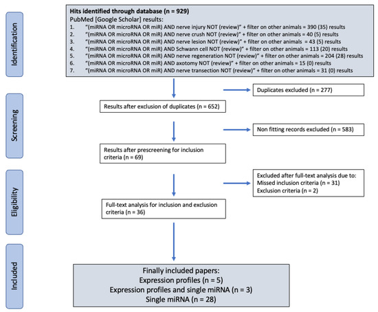 Systemic literature research was performed with the searching engines PubMed and Google Scholar. For the literature search, we established a search algorithm with the key words “miRNA or microRNA or miR” combined with the terms “nerve injury”, “nerve crush”, “nerve lesion”, “Schwann cell”, “nerve regeneration”, “axotomy”, and “nerve transection”. The results from systematic literature research with the selection process are summarized by the flow diagram below (Figure 1).