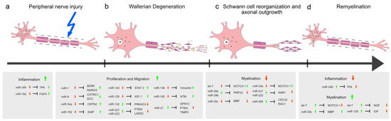 As described at a previous point in this review, SCs undergo a transdifferentiation process in response to a nerve lesion [8,9]. The repair phenotype is characterized by an increased proliferation and migration driven by activator protein 1 (AP-1) transcription factor and by a downregulation of myelination program through decreased levels of early growth response 2 (EGR2/KROX20) [34]. Further, inflammation processes play an important role [9]. Certain miRNAs show characteristic expression profiles contributing to the changed behavior of SCs (Figure 2).
