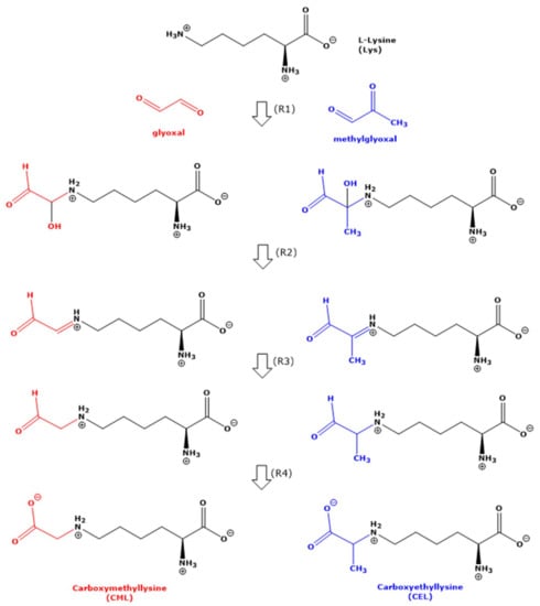 Proteinic L-lysine (Lys) residues undergo multiple post-translational modifications (PTM) including glycation of the ε-amine (Nε) group of Lys with various species. The advanced glycation end-products (AGEs) of these reactions are Nε-(1-carboxymethyl)-L-lysine (CML) and Nε-(1-carboxyethyl)-L-lysine (CEL). CML and CEL belong to the best-investigated AGEs. AGEs are widely used as markers for carbohydrate metabolism []. The concentration of circulating and excretory CML and CEL serves as a measure for the extent of the glycation of Lys residues in generally unknown proteins. In healthy humans, free glyoxal (GO) and methylglyoxal (MGO) occur in blood in the mid-to-upper nM-range [,,] and are excreted in the urine in the very low range of 0.1 to 5.6 pmol/mmol creatinine [,]. Glucose as an origin of MGO is questionable []. The circulating and excretory concentrations of CML and CEL in healthy humans are of the order of 2 µM, and their creatinine-corrected excretion rate is of the order of 2 µmol/mmol creatinine []. Thus, the concentrations of MGO and GO in human biological fluids are considerably lower than those of CEL and CML. Based on the concentration of CML and CEL rather than of GO and MGO, Nε-glycation of proteins is considered to play a significant role in various diseases, notably including diabetes and cardiovascular diseases [,].