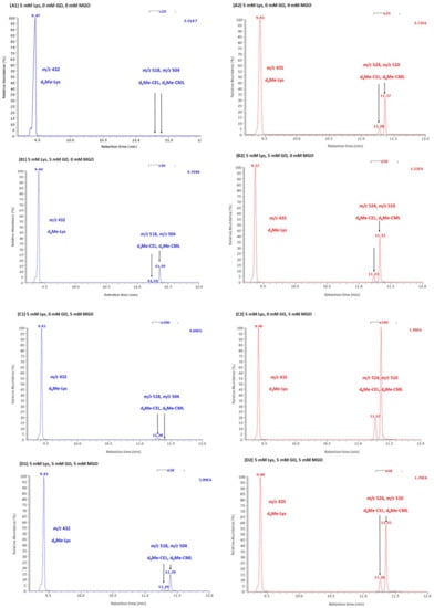 Representative partial GC-MS chromatograms from the reaction mixtures of Lys with GO, MGO and their mixture in 100 mM phosphate buffer, pH 7.4, for 1 min at room temperature. (A) Lys (5 mM) without GO or MGO. (B) Lys (5 mM) with GO (5 mM). (C) Lys (5 mM) with MGO (5 mM). (D) Lys (5 mM) with GO (5 mM) and MGO (5 mM). Selected-ion monitoring of m/z 432 for Lys, m/z for 504 for CML, m/z 518 for CEL and m/z 435, m/z 510 and m/z 524 for the respective deuterium-labeled analogs used as internal standard. The concentration of the internal standards was 500 µM for d3Me-Lys, 10 µM for d6Me-CEL and 10 µM for d6Me-CML. Note the magnification of the chromatogram from about 11.2 to 11.6 min. Arrows indicate the peaks of CEL and CML.